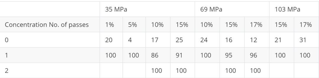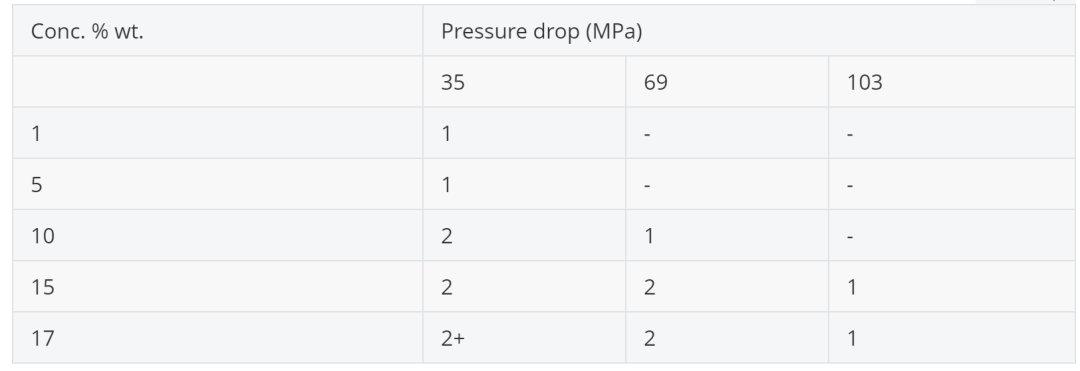 随颗粒浓度或连续相粘度增加,破碎动力学减缓,需更高通过次数或操作压力(能量输入)来实现完全分散。 -