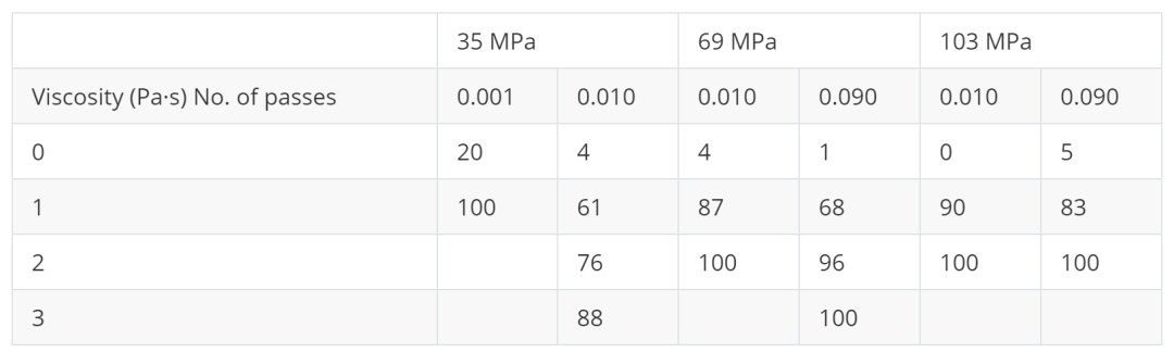 维持1%的低颗粒浓度,将分散介质粘度从0.001 Pa·s(水)提升至0.01 Pa·s(甘油溶液)后,在35 MPa压力下所需的完全解聚次数从1次增加至3次。当粘度进一步增至0.09 Pa·s时,破碎过程进一步延缓。然而,通过提高操作压力(即功率输入)可有效补偿高粘度带来的负面效应,例如在103 MPa下,处理0.09 Pa·s的分散体仅需2次通过即可完成解聚。与颗粒浓度的影响相比,粘度的增加对破碎动力学的减缓作用更为剧烈,这归因于高粘度会显著降低雷诺数、增大柯尔莫哥洛夫微尺度,从而抑制湍流强度。